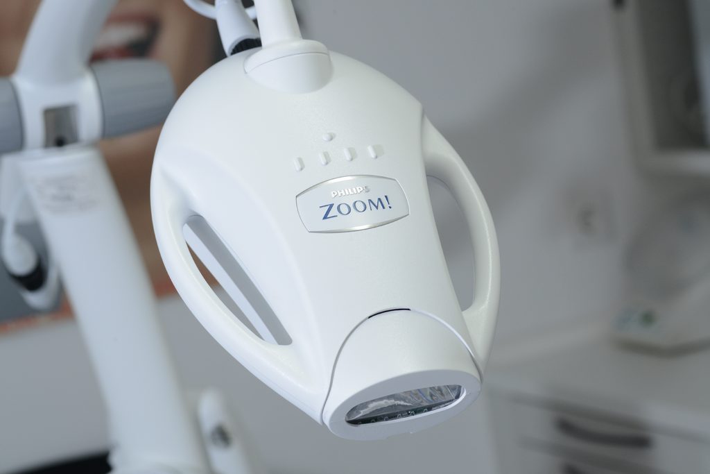 Bei der Philips Zoom Zahnaufhellung in der Praxis wird die Wirkung des Aufhellungsgels durch eine speziell hierfür entwickelte Lampe mit blauem LED-Licht verstärkt.